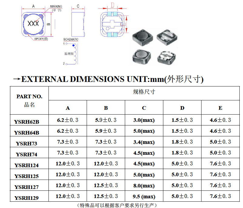 一系列感值: YSRH62B-2R9~YSRH62B-102 2.9UH~1000UH YSRH64B-2R9~YSRH64B-102 2.9UH~1000UH YSRH73-1R0M~YSRH73-102K 1.0UH~1000UH YSRH74-1R0M~YSRH74-102K 1.0UH~1000UH YSRH124-1R2M~YSRH124-102K 1.2UH~1000UH YSRH125-1R2M~YSRH125-102K 1.2UH~1000UH YSRH127-1R2M~YSRH127-102K 1.2UH~1000UH YSRH129-1R0M~YSRH129-152M 1.0UH~1500UH